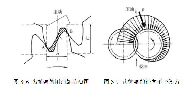 按上述對稱開的卸荷槽,當(dāng)困油封閉腔由大變至最小時(圖3-6),由于油液不易從即將關(guān)閉的縫隙中擠出,故封閉油壓仍將高于壓油腔壓力;齒輪繼續(xù)轉(zhuǎn)動,當(dāng)封閉腔和吸油腔相通的瞬間,高壓油又突然和吸油腔的低壓油相接觸,會引起沖擊和噪聲。于是CB—B型齒輪泵將卸荷槽的位置整個向吸油腔側(cè)平移了一個距離。這時封閉腔只有在由小變至最大時才和壓油腔斷開,油壓沒有突變,封閉腔和吸油腔接通時,封閉腔不會出現(xiàn)真空也沒有壓力沖擊,這樣改進(jìn)后,使齒輪泵的振動和噪聲得到了進(jìn)一步改善。
