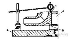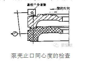 將相鄰的泵殼疊置于平板上,在上面的泵殼上放置好磁力表架,其上夾住百分表,表頭觸點與下面的泵殼的外圓相接觸,如圖所示。