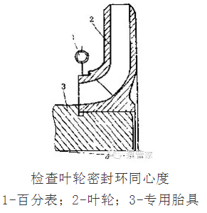 在水泵解體后,檢查葉輪密封環(huán)的磨損程度,若在允許范圍內(nèi),可在車床上用專門胎具脹住葉輪內(nèi)孔來車修磨損部位,修正后要保持原有的同心度和表面粗糙度。最后,配制相應(yīng)的密封環(huán)和導(dǎo)葉襯套,以保持原有的密封間隙。葉輪密封環(huán)經(jīng)車修后,為防止加工過程中胎具位移而造成同心度偏差,應(yīng)用專門胎具進(jìn)行檢查,如圖所示。