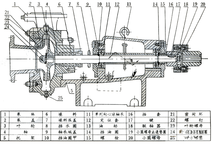 圖1表示BA型水泵的縱剖面結(jié)構(gòu)圖,軸的兩端以單列向心球軸承支承,用稀油潤(rùn)滑。