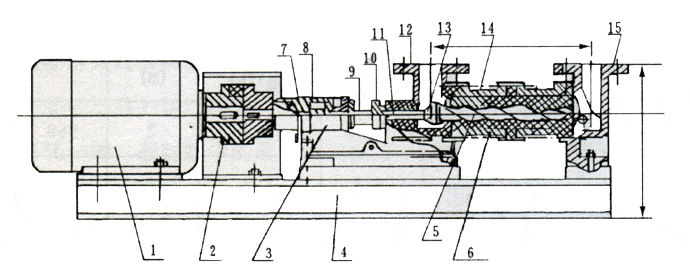 I-1B濃漿泵結(jié)構(gòu)圖說明:1、電機2、聯(lián)軸器3、軸承體4、電機機座5、螺桿軸6、橡膠套7、銷帽8、軸承9、空心軸10、填料壓蓋11、繞軸12、三通泵體13、銷帽14、直筒15、進口