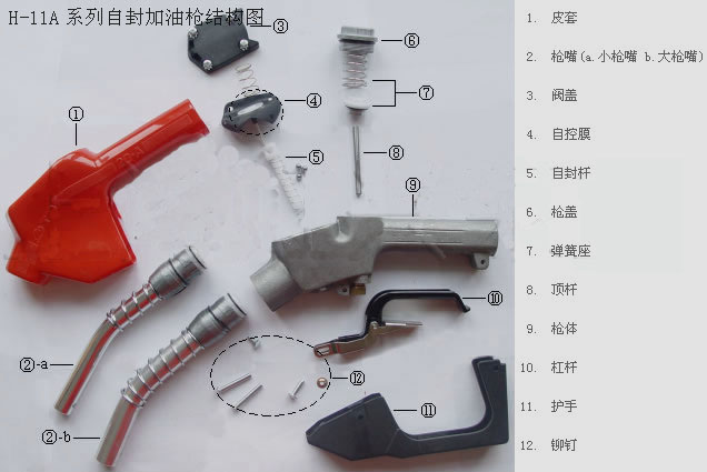 H-11A系列自封加油槍適合于煤油、汽油、柴油等輕質(zhì)油類的加注作業(yè)。融于槍身設(shè)計的自封裝置能夠確保在容器加滿時自動關(guān)閉油槍,防止介質(zhì)外溢。槍托部位安裝的定位片,可實現(xiàn)流量呈2-3檔分布。進油口連接螺紋可根據(jù)需要加工成多種標(biāo)準(zhǔn),方便顧客選擇與使用。