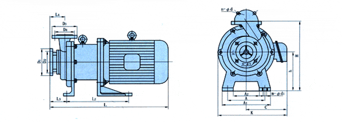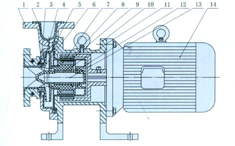 驅(qū)動裝置采用主動磁鐵聯(lián)軸器直接裝在電機(jī)軸上,泵室完全封閉,通過磁力偶合間接驅(qū)動泵軸上帶磁鐵的葉輪旋轉(zhuǎn)結(jié)構(gòu)緊湊、安全節(jié)能。