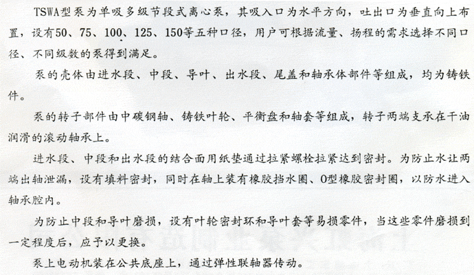 TSWA型臥式多級離心泵系列臥式、單吸多級、分段式結(jié)構(gòu),是新開發(fā)生產(chǎn)的節(jié)能系列產(chǎn)品。具有效率高,運行噪音低,抗汽蝕性能好,結(jié)構(gòu)合理,使用壽命長等顯著優(yōu)點。主要輸送清水或物理化學性質(zhì)類似于水的其他液體。產(chǎn)品執(zhí)行JB/T1051-93《多級離心泵型式與基本參數(shù)》標準。 本司產(chǎn)品全部采用計算機設(shè)計和優(yōu)化處理,公司擁有雄厚的技術(shù)力量、豐富的生產(chǎn)經(jīng)驗和完善的檢測手段,從而保證產(chǎn)品質(zhì)量的穩(wěn)定可靠。