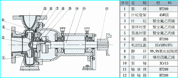 IHF氟塑料化工提升泵為單級(jí)單吸式氟塑料合金化工離心泵,該泵是按照國(guó)際標(biāo)準(zhǔn)并結(jié)合非金屬泵的加工工藝設(shè)計(jì)生產(chǎn)。泵體采用金屬外殼內(nèi)襯聚全氟乙丙烯(F46),泵蓋、葉輪和軸套均用金屬嵌件外包氟塑料整體燒結(jié)壓制成型,軸封采用四氟填充材料,進(jìn)出口均采用鑄鋼體加固。