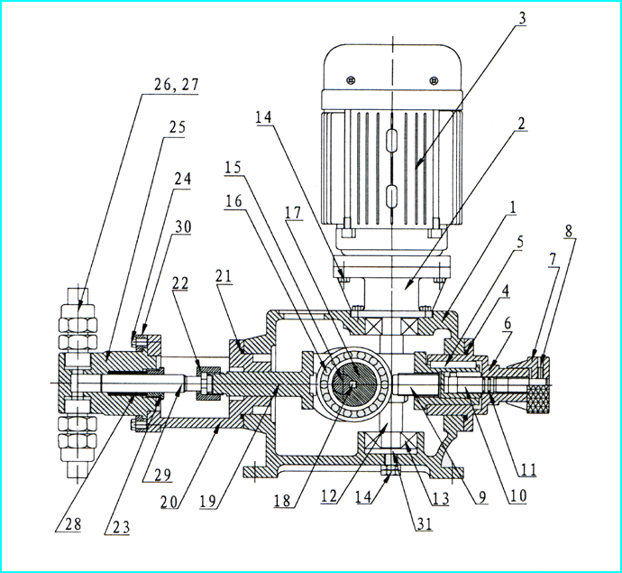 | 6 | 調(diào)節(jié)器 | 14 | 調(diào)節(jié)螺絲 | 22 | 柱塞壓緊帽 | 30 | 泵頭壓板 |